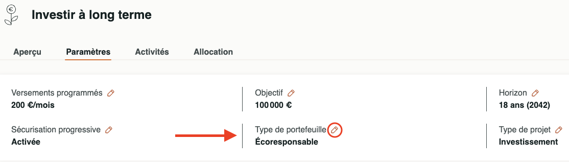 👉 Cliquez sur l'onglet "Paramètres" puis sur le crayon à côté du "Type de portefeuille"