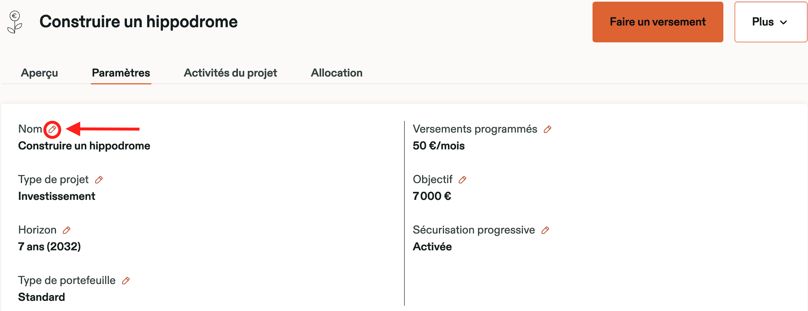 Comment changer le nom d'un projet ? Afin de modifier le nom d'un projet, cliquez sur le projet concerné puis rendez-vous dans la rubrique "Paramètres". Il vous suffit ensuite de cliquer sur le crayon figurant à droite et d'entrer le nouveau nom que vous souhaitez.