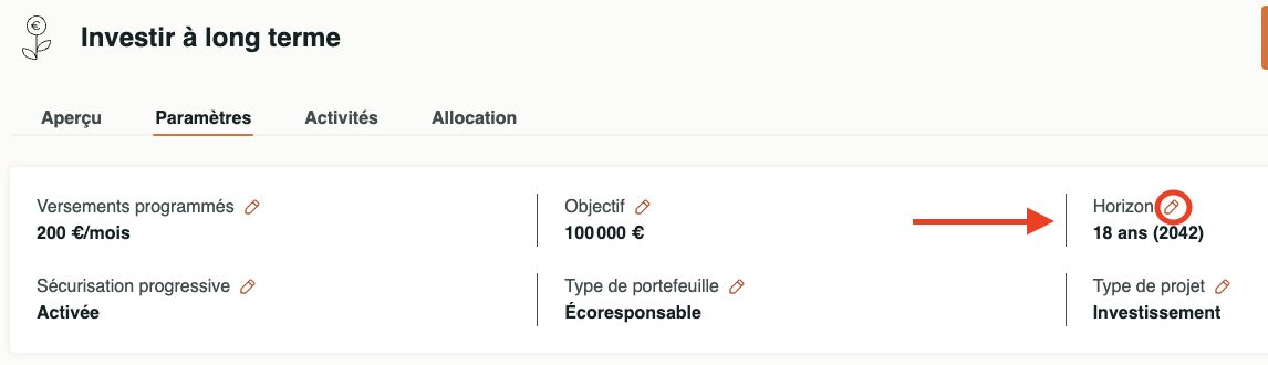 Cliquez sur le crayon à côté de "Horizon" et indiquez la durée de placement souhaitée