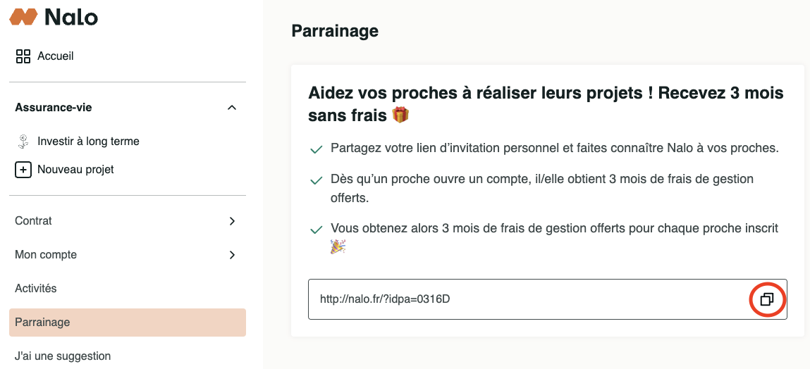Comment devenir ambassadeur Nalo? Pour parrainer un proche, il vous suffit de vous rendre sur l'onglet "Parrainage" de votre page d'accueil et de lui partager le lien indiqué. Une fois que sa souscription aura été finalisée, vous bénéficierez de trois mois de frais de gestion offerts 🎉 📚 À lire également : Quels sont les avantages du programme de parrainage ?