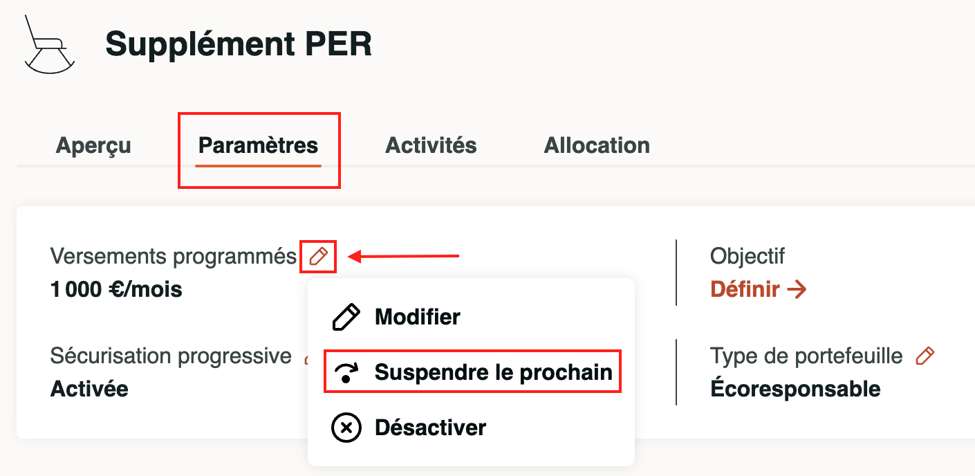 2) Suspendre ma prochaine échéance de versements programmés