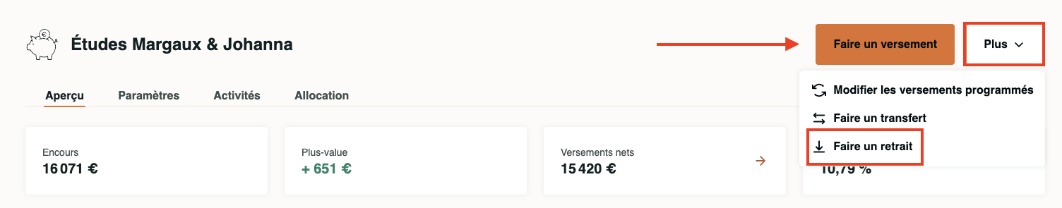 2) Cliquez sur "Plus" à droite de l'intitulé du projet puis sur "Faire un retrait" :