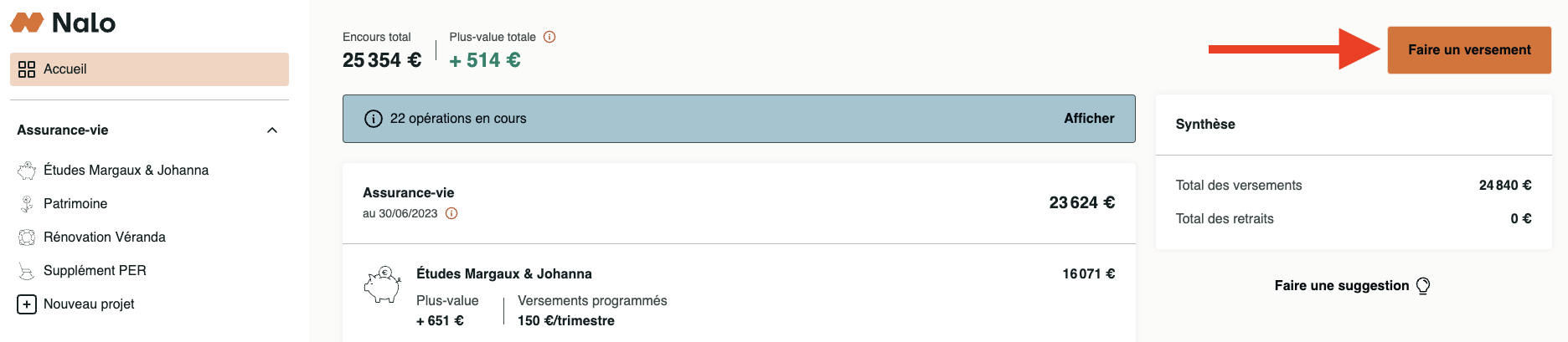 Comment réaliser un versement ponctuel? Depuis l'écran d'accueil de votre espace (ou depuis un de vos projets), cliquez sur le bouton "Faire un versement" en haut à droite de votre écran. Suivez les étapes jusqu'à la validation. 📚 À lire également : Comment mettre en place, modifier ou annuler mes versements programmés ? En combien de temps mon versement est-il exécuté ?