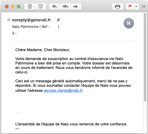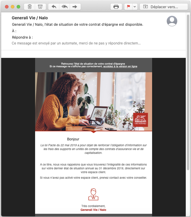 ➡️ En tant que partenaire assureur, Generali est légalement tenu de vous informer d’évolutions réglementaires ou d’activités sur votre contrat Nalo (versement, arbitrage...).